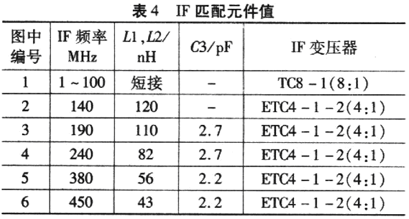 該匹配網(wǎng)絡(luò)對(duì)40MHz以上(包括40MHz)的IF最為合適。對(duì)于40 MHz以下的IF頻率,若串聯(lián)電感器(Ll、L2)的電感值取得過(guò)高,用這樣的電感和寄生效應(yīng)將影響穩(wěn)定性,因此,8:1變壓器適合于低IF頻率。適用于 IF頻率的低通濾波的匹配元件值如表4所示。高Q值線繞片式電感器(Ll、L2)大大改善了混頻器的轉(zhuǎn)換增益,但對(duì)線性度還是有點(diǎn)影響。
