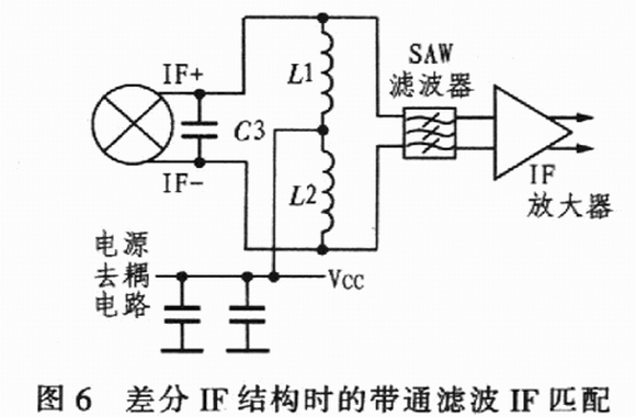 對(duì)整個(gè)差分IF結(jié)構(gòu)來(lái)說(shuō),還可以從另一個(gè)角度考慮,不用IF變壓器,如圖6所示,這里,混頻器的lF輸出匹配直接通過(guò)1個(gè)SAW濾波器,混頻器IF端的電源由IF匹配網(wǎng)絡(luò)中的電感器提供。計(jì)算Ll、L22和C3的值,使之在期望的IF頻率上諧振,并獲得高品質(zhì)因數(shù)和理想帶寬。調(diào)整L和C值,以消除混頻器內(nèi)部2.5 pF電容和SAW濾波器輸入電容的影響。在這種情況下,由于帶通網(wǎng)絡(luò)不變換阻抗,其差分lF輸出阻抗是400Ω。若SAW濾波器的輸入阻抗大于或小于 400 Ω,就需要附加匹配元件。