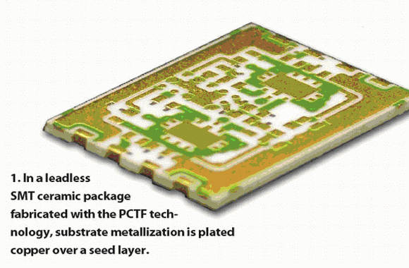 采用無引腳的陶瓷SMT技術的優點很多,采用PCTB技術制造陶瓷SMT封裝,陶瓷襯底始終是無引腳SMT封裝的基底,上面覆蓋一層環氧材料的覆蓋層,或者使用金屬環型框架/蓋板形成氣密的腔體(圖1),。采用在種子層(seed layer)上鍍銅,最后鍍鎳-金層,實現襯底的金屬化。因此該封裝可以承受多次焊接以及+400°C的高溫。該方案還支持標準裝配技術,例如高溫合金芯片粘合、環氧材料粘合、BGA(ball-grid-array)封裝、倒扣封裝以及ribbon鍵合技術。PCTF封裝還可以采用無磁性材料,適用于核磁共振成像MRI(magnetic-resonance-imaging)系統等無磁應用。