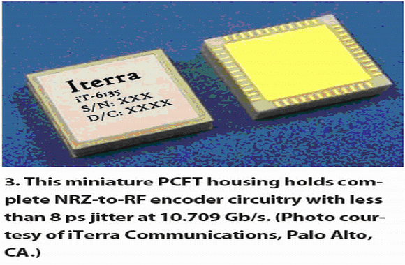 iTerra是另一家廣泛采用PCTF封裝技術的公司,該公司主要生產高端微波器件以及高速數字、光纖通訊網絡產品。iTerra生產的10.709 Gb/s NRZ(不歸零)到RZ(歸零)編碼器,采用了高氣密型(1×10-8 cm2/s)無引腳陶瓷PCTF封裝,能有效地散發出其5瓦的功耗,該模塊集成度高,電路密度大(圖3)。采用PCTF封裝,配上阻抗匹配電路,該模塊可以保證較寬溫度范圍內的信號完整性(小于8ps的抖動)。