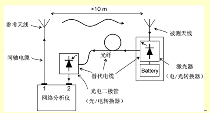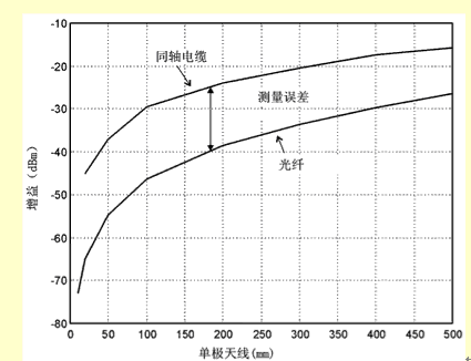 一般地講,我們不知道發射元件的效率和放大器的增益分別是多大(至少不能通過測量得到,但可以通過模擬或者模型分析得到這些數據)。相反,G/T損失是直接通過測量天線的輸出噪聲總功率得到的,這時天線是放在一個特殊的環境中(例如在消聲室中,Ta=T0),增益是用增益置換法借助一個增益已知的參照天線通過測量得到的。但是要小心。要通過標定把測量設備產生的噪聲去掉,在測量時沒有金屬物體(同軸電纜線或者電源線)和它相連。由于這個原因,萊爾德科技公司研制了一種代替電纜線的系統,它利用了光纖的原理,連同一個用電池供電的前置放大器,這些在一起可以妥善地測定小天線的電氣特性(見圖1)。估計同軸電纜線引入的測量誤差的設置如圖2所示。圖2中,在單極天線從基板上伸出來的長度不同的情況下,用同軸電纜線和光纖系統測量了它們的增益。可以看到,在長度為10mm左右(這是內置天線的實際長度)時,測量誤差超過20dB。