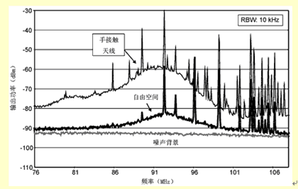 最后,要注意人體對小天線在FM調頻頻帶的增益的影響是正面的,尤其是使用者的身體與天線或者底板接觸的情況下。這是因為,在100MHz左右,人體是效率相當好的天線,半波長是1.5m左右。圖3給出了人體接觸天線和沒有接觸天線時,接收天線的輸出頻譜。很明顯,用手接觸天線時,G/T提高了10~15dB。由于大多數使用者在聽電話時和移動電話是靠得很近的,所以可以合理地假定,FM調頻天線的實際性能優于它處在自由空間時的性能。