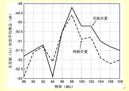 在發射時,發射元件起標準的無源天線作用,它用一個單刀單擲(SPST)通斷控制進行連接(見圖4)。前置放大器處在Rx狀態,仍然與天線連接(但是切斷電源)。用一個內阻為50Ω的信號源供給信號時,失配的半圈天線的增益測定值如圖7所示。寬帶范圍的平均增益(或者效率)達到-53~-49dB。在開關和調頻發射組件之間接入一個匹配網絡,或者選擇適當的功放輸出阻抗,那么對輸出功率的要求可以放寬很多。