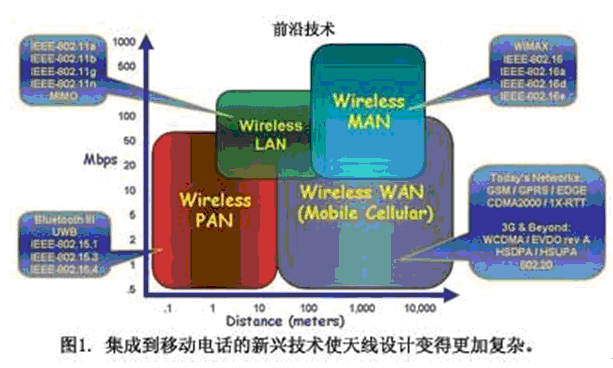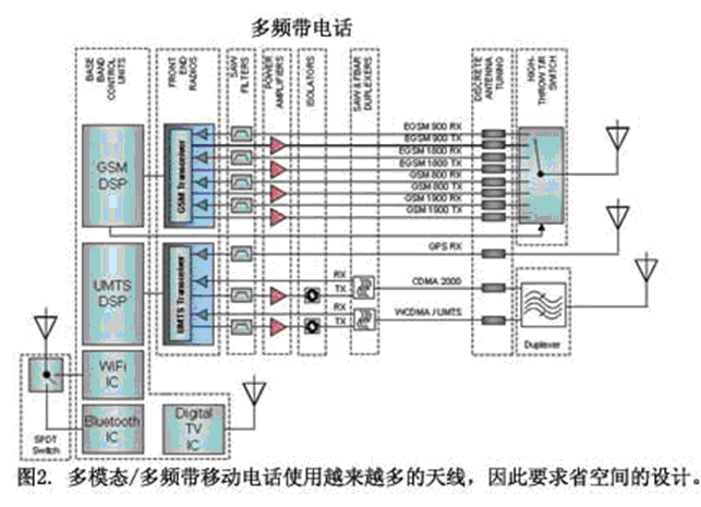 當一個天線發送不想要的信號(不論何種頻率)時,就會發生干擾,但不管怎樣仍然會被另一個天線接收。當移動電話相互靠近時就會發生干擾,移動電話設計者早就觀察到這個現象,并且采用多種電路與控制技術來解決干擾問題。直到最近,電話在進行蜂窩通話時只使用一個天線,也許還有第二個天線用于藍牙,而現在則可能有第三個用于GPS。這些多功能蜂窩電話通常帶有與藍牙和GPS天線隔離的蜂窩天線。隨著新標準和其它特性的出現(圖2),蜂窩電話攜載寬帶,甚至包括CDMA和GSM等競爭技術變得很有必要。再加上藍牙、WiFi和很快將被采用的WiMAX,移動電話設計者所面對的移動終端上會包含越來越多的天線。隨著UWB和MIMO收發器等個人和局域網技術的長足進步,蜂窩電話開發者已經意識到嚴重的干擾問題在等著他們。