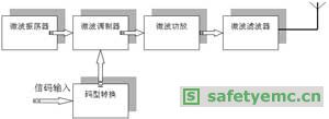 微波直接調制發射機的方框圖如圖1所示。來自數字終端機的信碼經過碼型變換后直接對微波載頻進行調制,然后,經過微波功放和微波濾波器饋送到天線,由天線發射出去。這種方案的發射機結構簡單,但當發射頻率較高時,頻調制發射機的中頻功放設備制作難度大,而且在一個系列產品多種設備的場合下,這種發射機的通用性差。