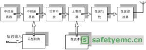中頻調制發射機的方框圖如圖2所示。信碼經過碼型變換后,在中頻調制器中進行調制,獲得中頻調制信號,然后經過功率中放,把這個己調信號放大到上變頻器要求的功率電平。上變頻器把它變換為微波調制信號,再經微波功率放大器放大到所需的輸出功率電平,最后經微波濾波器輸出饋送到天線,由發射天線將信號送出。