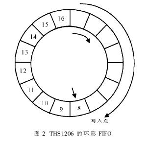 THS1206內部的FIFO安排成環(huán)形,采用讀取點、寫入點和觸發(fā)點控制讀寫操作,如圖2所示。芯片的轉換時鐘CONV_CLK控制采樣保持和A/D變換,CONV_CLK讓四個通道的信號同時采樣保持,然后分別轉換為數(shù)字信號并自動順序寫入FIFO,同時FIFO的寫入點向前移動,指示下一個寫入點;當FIFO內的數(shù)據(jù)達到預定的觸發(fā)深度時,發(fā)出數(shù)據(jù)就緒信號DATSA_AV發(fā)出,DSP讀取轉換數(shù)據(jù),同時清除DATA_AV信號,讀取點和觸發(fā)點向前移動。芯片的工作方式由兩個寄存器控制,通過寫寄存器,可以選擇使用通道、工作模式、FIFO觸發(fā)深度、DATA_AV的極性與觸發(fā)方式等。