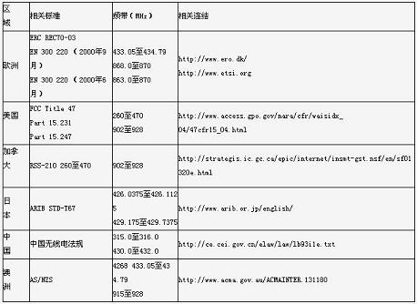 表II中提供了各種低于1GHz標準的更多細節說明,這并不是一個最完整的列表,如需要更多的細節,可從表中所提供的網路連結去取得。