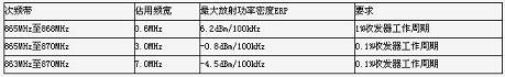 如表三所示,為使用FHSS時,歐洲的擴展頻帶上(低于870MHz)所需要的頻道數量、有效發射功率(ERP)、及工作週期。當符合"說前先聽(listen-before-talk,LBT)"或是工作週期有效率限制值時,便可有高達7MHz的頻寬可供使用,以往則只有2MHz的范圍。