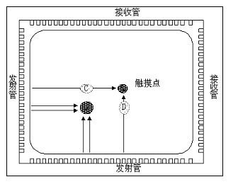 當有觸摸時,手指或其它物就會擋住經過該位置的橫豎紅外線,觸摸屏掃描時發現并確信有一條紅外線受阻后,紅燈亮,表示有紅外線受阻,可能有觸摸,同時立刻換到另一坐標再掃描,如果再發現另外一軸也有一條紅外線受阻,黃燈亮,表示發現觸摸,并將兩個發現阻隔的紅外對管位置報告給主機,經過計算判斷出觸摸點在屏幕的位置。