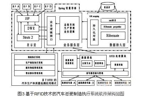 本系統(tǒng)采用B/S架構(gòu),在J2EE開發(fā)環(huán)境下,結(jié)合Struts2、Hibernate、Spring、DWR等主流開源框架,具有良好的跨平臺兼容性?;赗FID技術(shù)的汽車總裝管理系統(tǒng)的軟件架構(gòu)如圖3所示: