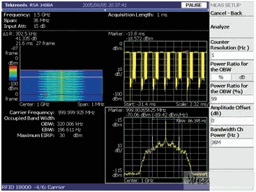 政府規(guī)定要求控制發(fā)射信號(hào)的功率、頻率、帶寬。這些規(guī)定防止有害干擾并保證每個(gè)發(fā)射者都是頻帶內(nèi)其他用戶(hù)的友好鄰居。對(duì)于許多頻譜分析儀特別是通常用于脈沖信號(hào)能量測(cè)量的掃頻頻譜分析儀,進(jìn)行此類(lèi)測(cè)量是具有挑戰(zhàn)性的。RTSA 能夠分析一個(gè)完整的分組發(fā)射過(guò)程的能量特點(diǎn),也能直接測(cè)量跳頻信號(hào)的載波頻率,而無(wú)需將信號(hào)置于一個(gè)跨度的中心。按一下按鍵,分析儀就能識(shí)別一個(gè)瞬時(shí) RFID 信號(hào)的調(diào)制方式并能夠?qū)β省㈩l率和帶寬進(jìn)行監(jiān)管測(cè)量,使預(yù)一致性(pre-compliance)測(cè)試過(guò)程變得非常靈活和方便 [參閱圖2]。預(yù)一致性測(cè)試有助于確保產(chǎn)品一次通過(guò)一致性測(cè)試,而無(wú)需重新設(shè)計(jì)和重新測(cè)試。