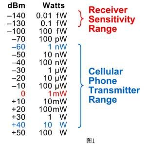 分貝dB是一個(gè)相對(duì)的值。另一個(gè)相關(guān)的單位是毫瓦分貝dBm,它是相對(duì)于1mW的絕對(duì)功率。圖1給出了dBm的值及其相應(yīng)的瓦特?cái)?shù),其中還給出了移動(dòng)電話的發(fā)射機(jī)發(fā)射功率參考范圍,以及靈敏接收機(jī)所能檢測(cè)到的最低信號(hào)功率。圖2給出的等式定義了室溫下射頻信號(hào)的理論熱噪聲。由于射頻信號(hào)通過空氣的傳輸以及受到大氣干擾和其它信號(hào)的干擾,到達(dá)接收機(jī)端的信號(hào)電平可能變得非常低。接收機(jī)常常需要檢測(cè)低于0.1pW的信號(hào)(或者低于微伏的信號(hào)電平)。