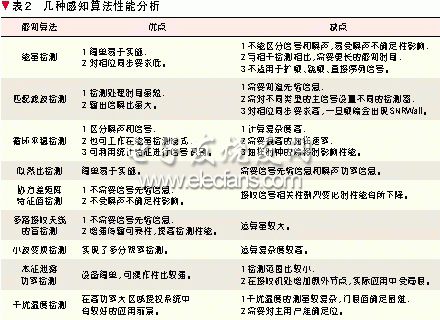 以上這些算法都是對主用戶發(fā)射端信號的直接檢測,基本都是從經(jīng)典的信號檢測理論中移植過來的。此外,近期一些文獻從主用戶接收端的角度提出了本振泄露功率檢測和基于干擾溫度的檢測。有些文獻對經(jīng)典算法進行了改進,如文獻[2]提出了一種基于能量檢測-循環(huán)特征檢測結合的兩級感知算法。文獻[3]研究了基于頻偏補償?shù)钠ヅ錇V波器檢測、聯(lián)合前向和參數(shù)匹配的能量檢測、多分辨率頻譜檢測和基于小波變換頻譜檢測等。表2歸納了文獻中提及較多的一些感知算法,并對其優(yōu)缺點進行了比較。