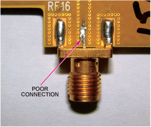 其次需要考慮PCB的裝配連接器與PCB傳輸線路之間的結(jié)點(diǎn)至關(guān)重要,因此連接器的焊接會(huì)對(duì)過(guò)渡產(chǎn)生重大影響。連接不良或未對(duì)齊的連接器會(huì)破壞電感和電容之間的微妙平衡,從而影響結(jié)點(diǎn)的阻抗。圖5是一個(gè)焊接不良的連接器結(jié)點(diǎn)示例。