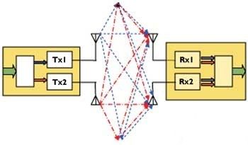 通過使用多路傳輸方式,在每個(gè)接收天線上采用空間微分技術(shù),使得DSP能夠進(jìn)行信號(hào)分離并恢復(fù)原始的兩路數(shù)據(jù)流。使用相同射頻信道的獨(dú)立發(fā)射器,在它們各自的天線上發(fā)送出獨(dú)立的數(shù)據(jù),然后,接收天線匯集所有發(fā)射器的復(fù)合信號(hào)。通過巧妙設(shè)計(jì)的MIMO報(bào)文和先進(jìn)的DSP,就可以恢復(fù)出獨(dú)立的數(shù)據(jù)流。數(shù)據(jù)速率與發(fā)射器和天線數(shù)量之間具有幾乎線性的關(guān)系,速率的提高并不需要增大信道帶寬。