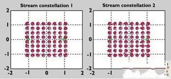 圖2 Tx1和Tx2的64 QAM數(shù)據(jù)流信號(hào)的群視圖,這是一種理想情況,其中調(diào)制信號(hào)是沒有失真的