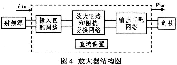 典型的放大器一般包括輸入匹配網絡、晶體管放大電路、阻抗變換網絡、直流偏置和輸出阻抗匹配網絡,如圖4所示。確定阻抗匹配網絡中元件的參數、類型以及連接關系是實現匹配網絡的關鍵。阻抗匹配是射頻電路設計的重要問題,其目的是為了實現能量的最大功率傳輸,提高能量的傳輸效率。