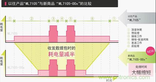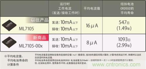 LAPIS Semiconductor去年推出的“ML7105”,實現(xiàn)了業(yè)界頂級的低耗電量(收發(fā)數(shù)據(jù)包時的運(yùn)行狀態(tài))。此次開發(fā)出的新品“ML7105-00x”,不僅保持了運(yùn)行狀態(tài)下的低耗電量性能,而且平均電流還減少了一半。所謂平均電流,是指按一定間隔反復(fù)收發(fā)數(shù)據(jù)包時的運(yùn)行狀態(tài)(耗電量大)與休眠狀態(tài)(耗電量?。┑钠骄娏髦?。通過大幅減少改變狀態(tài)所需的時間,使平均電流減半,從而使電池壽命可達(dá)2倍。因此,按LAPIS Semiconductor的工況條件,支持Bluetooth® Low Energy的、使用紐扣電池(CR2032)的設(shè)備其電池壽命即使在24小時連續(xù)工作的條件下,也可充分使用2年。