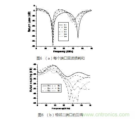 圖6給出了該相控陣前六個(gè)激勵(lì)端口的仿真回波損耗和和前七個(gè)天線的相鄰單元的耦合系數(shù)曲線??梢钥闯?,各個(gè)端口匹配良好,且互耦隨著間隔的增大而較小。