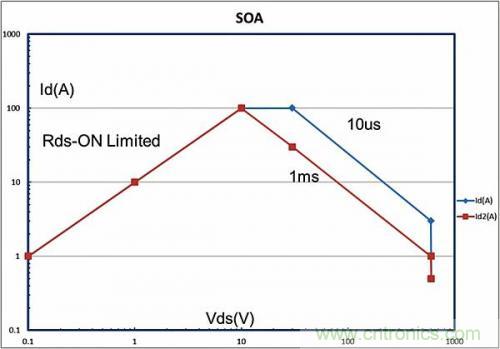SOA曲線所圈出的另外一個重要區域受到Rds-On的限制。在這個區域內,器件上的電壓就是流經器件的電流乘以導通電阻。在圖1所示的SOA曲線示例中,Rds-On為100毫歐。硅MOSFET的溫度取決于它們的Rds-On,這一點眾所周知。在器件溫度從25ºC升高至大約100ºC時,它們的Rds-On幾乎會加倍。
