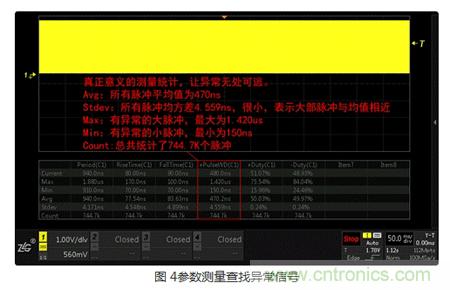 僅僅通過波形的直觀表現來分析異常信號遠遠不夠,只有將波形各項指標精確量化,才能看透波形異常的本質。ZDS2000系列示波器標配的51種“真正意義”的參數測量,會把屏幕上捕獲的所有波形進行統(tǒng)計分析,得出每一項的當前值、最大值、最小值、平均值、標準差、統(tǒng)計次數,用戶通過觀察最大值和最小值可快速了解波形中可能存在的異常,通過觀察平均值、標準差可快速評估信號特性。