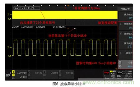 在調試異常信號時,我們通常需要明確,異常出現的頻率是多少,是不是周期性出現的呢?為了弄清楚這些問題,一般需要長時間記錄波形,然后基于這樣一個龐大的數據庫去定位和分析異常。ZDS2000系列示波器標配的“搜索功能”,可以在海量的數據中快速定位出感興趣的信號,并自動做出標記,用戶通過觀察標記可快速了解異常的位置、頻率、周期等特性。