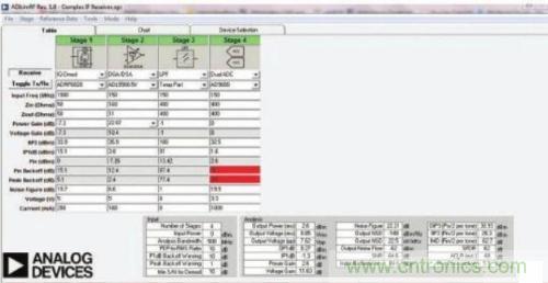 在為接收器設(shè)計(jì)設(shè)置級(jí)聯(lián)噪聲系數(shù)和截距模型時(shí),你實(shí)際上需要為系統(tǒng)建模三次:一次針對(duì)最小信號(hào)電平,即最大增益下的AGC關(guān)閉電平;第二次針對(duì)最大信號(hào)電平,即最大增益衰減下的AGC開(kāi)啟電平;最后一次針對(duì)接收器的標(biāo)稱輸入電平。你還需要在所有三種模型中考慮交調(diào)效應(yīng)。幸運(yùn)的是,ADI的 ADISIMRF(圖1)等免費(fèi)工具將助您一臂之力;這類工具通常內(nèi)置適用于RF增益塊、混頻器、衰減器、巴倫、濾波器和高速轉(zhuǎn)換器的模型庫(kù)。