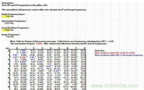 圖2. 樣本混頻器表,顯示在混頻過(guò)程中產(chǎn)生的多種nf1 ± mf2產(chǎn)物,其中f1和f2分別是混頻器的RF輸入和本振輸入頻率。