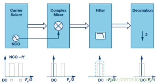 典型DDC模塊包括載波選擇、下變頻器、濾波器和抽取器。這些功能模塊按順序工作,或者可分別予以旁路,最終根據后續FPGA或ASIC(其采樣速率較低)的要求,產生一個位于DC的復信號或一個實信號。