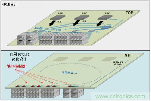 為了管理所有這些信號,典型的設計實施涉及高引腳數現場可編程門陣列(FPGA)、I2C多路復用器、移位寄存器、LED驅動器和額外的印刷電路板(PCB)層。這些方法難以實施,電路板很擁擠,并且不易擴展——直到現在,都是如此。TI的FPC401四端口控制器為這一設計挑戰提供了更簡單的解決方案。