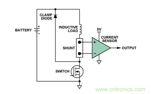 本例將詳細(xì)介紹一種典型的高端電流檢測(cè)應(yīng)用。圖1所示為汽車應(yīng)用環(huán)境中用于監(jiān)控電磁閥或其它感性負(fù)載的常見配置。