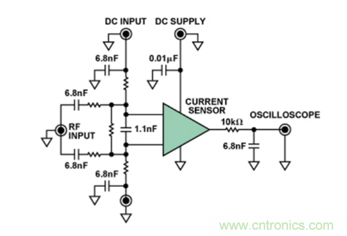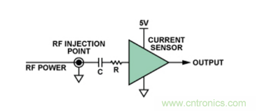具體而言,這些測(cè)試都采用 “直接功率注入法”完成,這是一種通過電容將RF信號(hào)耦合至特定器件引腳的方法。根據(jù)待測(cè)IC的類型,針對(duì)不同的RF信號(hào)功率水平和頻率范圍,測(cè)試器件的每路輸入。圖4顯示了在特定引腳上執(zhí)行直接功率注入測(cè)試的原理示意圖。