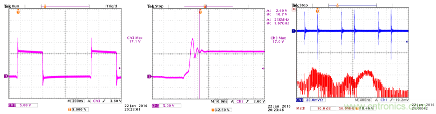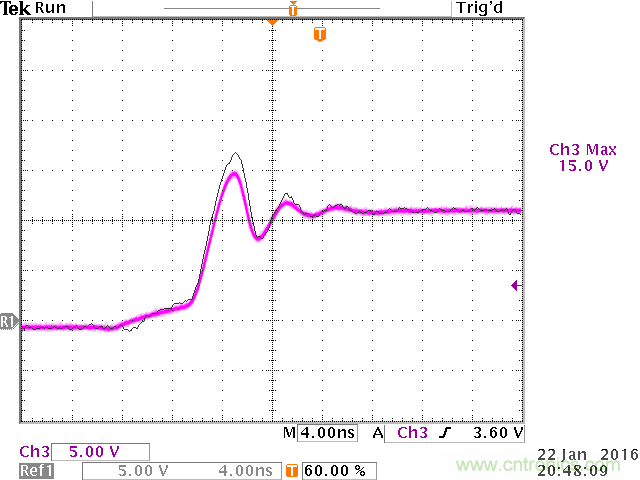 從實驗結果來看,開關切換波形上的過沖實際上已經消失了,但還存在低頻的振鈴信號。