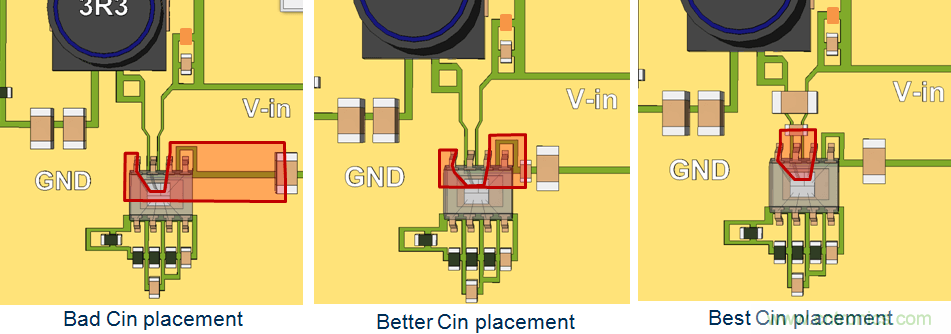 我們繼續使用單面PCB,并將CIN放置到靠近IC的地方,這樣就形成了比較小的CIN回路。參見圖20。