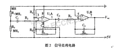 信號采集電路中的InSb-In薄膜磁阻元件采用三端差分型接法如圖1(b)所示,這種信號采集電路具有輸出信號較大和較強抑制溫漂的能力。信號處理電路采用阻容耦合型差動放大電路,在圖2中IC1和IC2為兩級差動放大,改變R2,R7,R5,R8的阻值可以調整放大倍數。集成運放的靜態電壓由R3和R6來調節,考慮到通常磁頭內的上、下兩個磁阻元件不完全平衡,MR1與MR2的阻值會有10%以內的差別,在+5 V的工作電源下,信號采集的輸出端電壓在2.4~2.6 V。為了減少信號在磁頭與運放之間阻容耦合中的損失,一般把集成運放靜態電壓設置為低于2.5 V,取2 V比較合適。