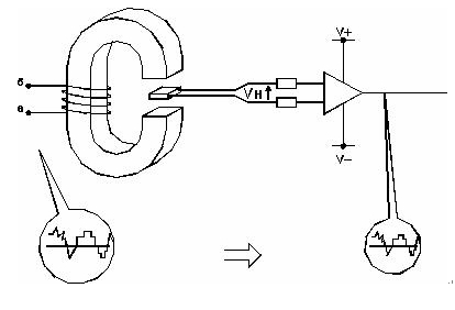 圖1.位于磁性電路間隙中的霍爾發(fā)生器把一次電流產(chǎn)生的磁場(chǎng)轉(zhuǎn)換成成比例的霍爾電壓