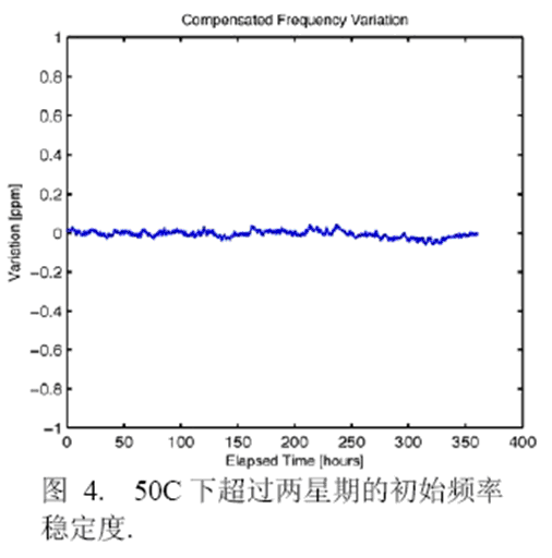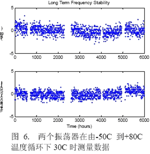 圖6顯示了在進(jìn)行溫度循環(huán)試驗時兩個振蕩器的頻率穩(wěn)定度。數(shù)據(jù)在-50℃到+80℃正溫度循環(huán)和負(fù)溫度循環(huán)中的30℃情況下獲得,數(shù)據(jù)采集自600個溫度循環(huán),以3ppm為規(guī)范容許范圍則沒有頻率漂移。