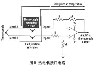 熱電偶根據兩個不同金屬線結點之間的溫度差提供電壓信號。熱電偶溫度傳感器具有一個感測端(金屬A/金屬B連接端)和一個參考端(金屬A和金屬B與銅導線連接端)。冷端參考溫度與熱電偶信號一道進行控制和測量。熱電偶具有大約10mV/℃~80mV/℃的小信號電平范圍和小的源阻抗。配置成差分放大器的單放大器(圖5)把信號放大到ADC輸入所需的電平。差分放大器增益為: