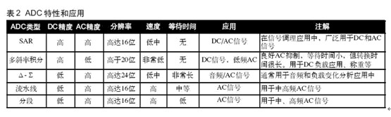 大多數信號調理應用采用逐次逼近(SAR)或積分型ADC。這兩種ADC能很好地處理dc信號,而SAR型ADC對快速ac信號能提供更好的支持(表2)。SAR轉換器是所有ADC中最通用的,這種轉換器把高分辨率(高達16位)和高吞吐能力結合在一起。