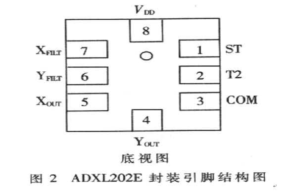 ADXL202的封裝形式為LCC-8,其封裝和引腳的示意圖如圖2所示。