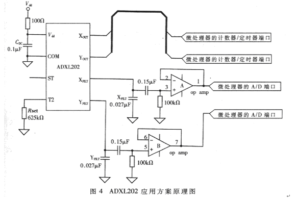 汽車防盜中,車體傾斜角度的測量要求其信號的噪聲必須很小,這就要限制信號帶寬。而對于振動的測量,則需要10~200Hz的較寬信號范圍。首先,將XFILY、YFILT引腳的濾波電容CX、CY設定為0.027μF,這樣輸出的數字、模擬信號的帶寬全都限制在200Hz以下,再將ADXl202輸出的帶寬為200Hz的數字和模擬信號分別經過低通濾波和高通濾波,就可以獲得傾斜、振動監測所需帶寬的信號。將ADXL202同時作為振動測量和傾角測量傳感器的方案原理圖如圖4所示。