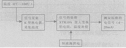 整套系統(tǒng)要求在0~100℃范圍對(duì)應(yīng)輸出4mA~20mA的電流型溫度變送器。