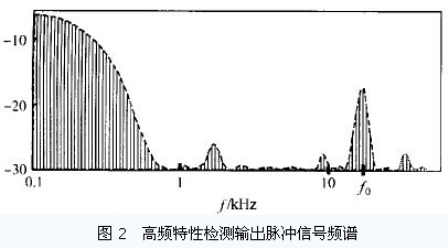 在該頻譜圖中, f 低于2 kHz 時的頻譜的形狀與原調制信號的頻譜的形狀相似Z 脈沖畸變引起的信號頻譜的變化主要表現是: 在3 kHz 到5MHz 頻段內會出現一個與駐波點位置密切相關的較大峰值.該峰值的頻率f0 除與駐波點位置有關外, 還與同軸電纜的品質、高低頻信號分離電路的特性等有關. 經大量的測試證明, 在對傳感器進行校正后, f只與駐波點位置(即同軸電纜受力位置) 有關, 且f與駐波點和高低頻信號分離電路之間的距離d 呈非線性關系.在1m < d < 1km 時, f2= K/d2+ P ,其中K 為與同軸電纜品質相關的常數, P 為與傳感器的電路相關的常數.