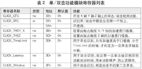 諾基亞8800CA手機(jī)除了有“翻轉(zhuǎn)靜音”的功能外,還有雙擊手機(jī)顯示時(shí)鐘的功能。其中敲擊的識(shí)別可以通過(guò)加速度傳感器來(lái)實(shí)現(xiàn)。LIS35DE集成了識(shí)別單擊或雙擊的功能模塊,通過(guò)寄存器設(shè)計(jì)就可以識(shí)別出單擊以及兩次單擊是否符合雙擊的條件。LIS35DE的單雙擊功能由地址為38h~3Fh的寄存器控制,如表2所示。
