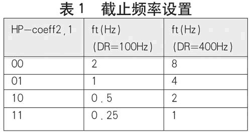 由于重力的存在,用戶不能簡(jiǎn)單地在FF_WU_TSH1寄存器中設(shè)置統(tǒng)一的門(mén)檻值來(lái)作為晃動(dòng)或者喚醒中斷的判定條件。為此,LIS35DE集成了高通濾波器,能夠?yàn)V除緩慢變化或不變的加速度(如重力加速度),并且可以選擇截止頻率,如表1所示。只有變化頻率高于截止頻率的加速度才能通過(guò)。
