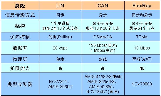 表1:不同汽車總線比較及典型收發(fā)器。