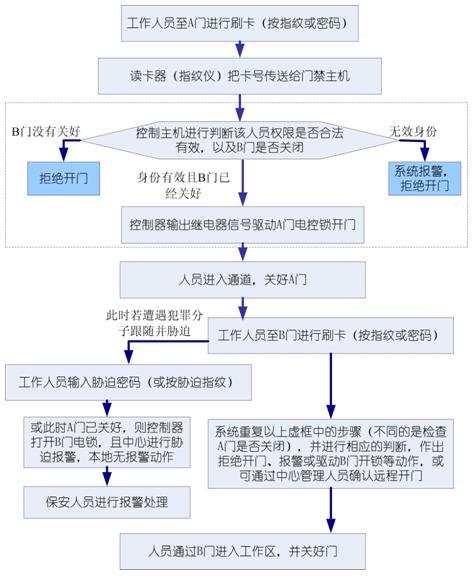 首先解釋一下AB門(mén)雙門(mén)互鎖的概念,所謂雙門(mén)互鎖聯(lián)動(dòng)是指AB兩道門(mén)具有互鎖聯(lián)動(dòng)的功能,即當(dāng)一道門(mén)被打開(kāi)時(shí),另一道門(mén)將打不開(kāi),只有當(dāng)兩道門(mén)都關(guān)上時(shí),才能打開(kāi)其中的任一道門(mén)。在高安全場(chǎng)所通道門(mén)禁應(yīng)用中,特定人員進(jìn)入第一道門(mén)后必須要按照操作要求鎖好第一道門(mén)才能進(jìn)入第二道門(mén),如進(jìn)入第一道門(mén)后沒(méi)按要求關(guān)好此道門(mén),將不能進(jìn)入第二道門(mén),這樣做的目的是為了防止犯罪分子尾隨作案。