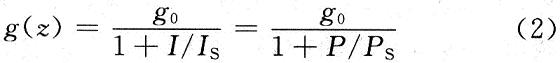 式中:g0是由泵浦強度定的小信號增益系數,由于增益飽和現象,隨著信號功率的增加,增益系數下降;Is,Ps分別為飽和光強和飽和光功率,是表明增益物質特性的量,與摻雜系數、熒光時間和躍遷截面有關。