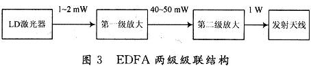 EDFA對光信號功率的放大,特別在無線光通信大功率(瓦級)應用中,常常采用級聯的方式,比如兩級或者三級放大。之所以采用級聯的方式,是因為在EDFA的摻鉺光纖(EDF)中插入一個光隔離器,構成帶光隔離器的兩段級聯EDFA,由于光隔離器有效地抑制了第二段:EDF的反向自發輻射(ASE),使其不能進入第一段EDF,減少了泵浦功率在反向ASE上的消耗,使泵浦光子更有效地轉換成信號光能量,從而可以明顯改善EDFA的增益、噪聲系數和輸出功率等特性。本文采用麗級級聯放大,將1~2mW的1550nm光信號,經EDFA放大到1W左右。級聯結構如圖3所示。